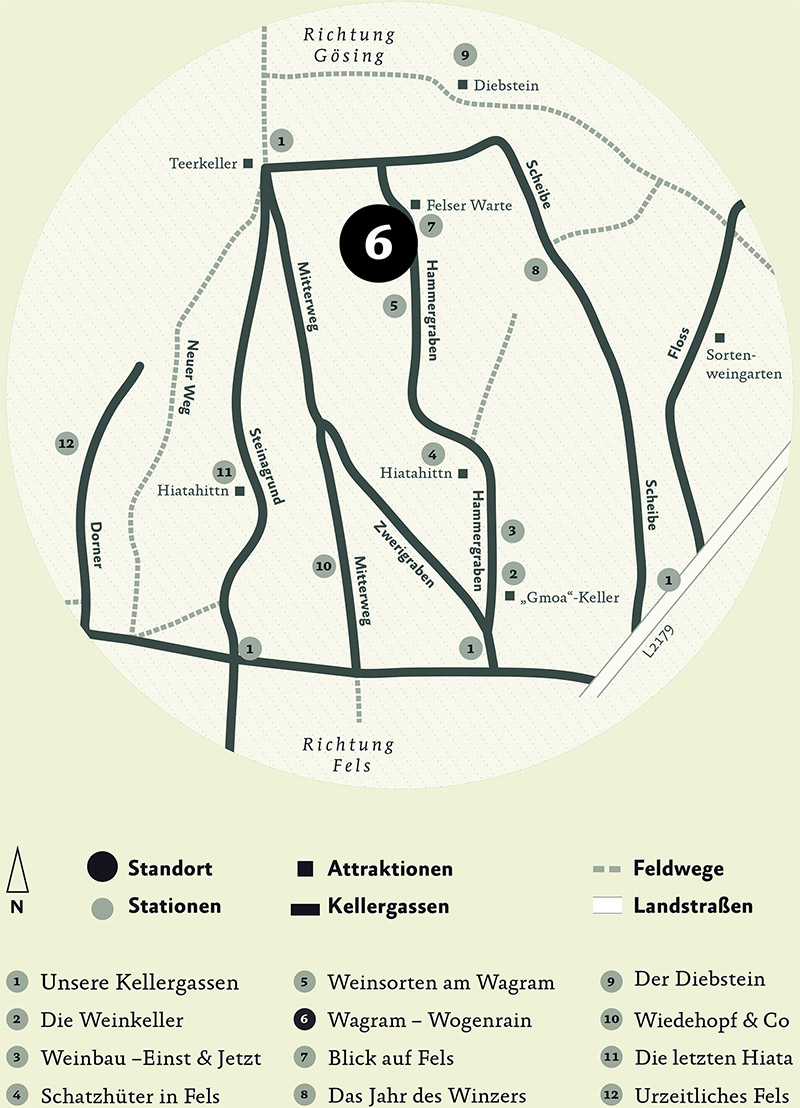 The Wagram is a wonderful original loam step, which is located north of the Danube. In the area, more than 2,700 hectares of vineyards spread over two very different zones: north of the Danube lies the Wagram, and south of the Danube, the small wine villages of Tullnerfeld and the historic wine town of Klosterneuburg. The vineyards are to the south, the climate and the deep moor loam soil – wind-blown dispersals on the banks of receding primeval sea – will give theincomprehensible spicy character to the grapes.