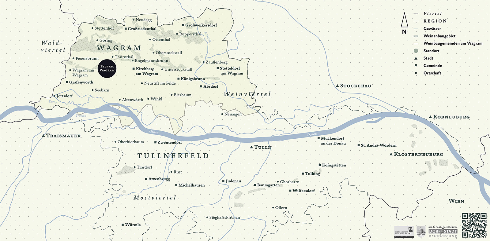 In dem Gebiet – bis 2007 noch „Donauland“ genannt - verteilen sich mehr als 2.700 Hektar Rebfläche auf zwei ganz unterschiedliche Zonen: Nördlich der Donau erstreckt sich der eigentliche Wagram, südlich der Donau liegen die kleinen Weinorte des Tullnerfelds und die historische Weinstadt Klosterneuburg vor den Toren Wiens.